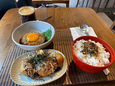 午市的定食,是可以任配搭的。主食,我就選了醬油蛋漢堡,而小食就是一份大阪章魚燒。配在普通的白飯同一杯咖啡。